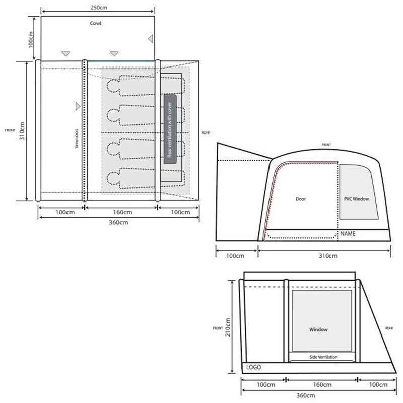 - Footprint: 360 x 310cm (+100cm cowl depth)