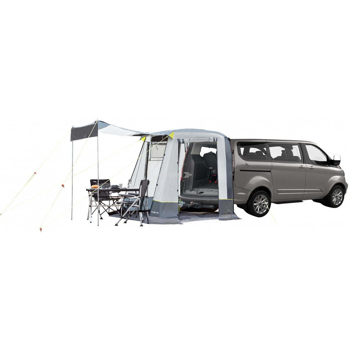 The Brunner Foyer Tail Gate Awning is designed for seamless attachment to the tailgate of the Ford Transit Custom and Ford Tourneo Custom 2023 (or vehicles with similar connection height) while providing shade and protection from wind and rain. Brunner Foyer tailgate awning is made from weather-resistant fabric with a sturdy frame. It sets up easily without complex tools. The front wall of the tent can either be rolled up or configured as a sun canopy, offering versatility for various weather conditions. Optimal air circulation, two generously sized mesh windows are positioned on the right-hand side and on the front wall. Additionally, tension straps and multiple guy ropes enhance the tent’s stability, ensuring it remains secure in varying outdoor environments. Foyer is lightweight and portable, it’s suited for outdoor adventures, camping, or road trips, giving you extra usable space without adding bulk.