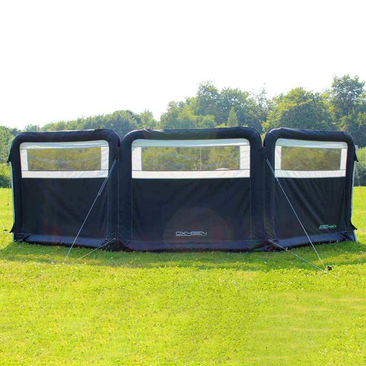 The Outdoor Revolution Oxygen Pro 3 Panel Windbreak is an inflatable windbreak used for camping and windy days outdoors. This premium five metre, three-panelled inflatable windscreen has been designed specifically for caravan, campervan owners and avid campers! Designed to deflect wind for up to five metres, crafted with aesthetics in mind to complement the style of your camping setup. With a modular design to extend the windbreak to suit your needs. Featuring high density all weather fabric, crystal clear windows and an intuitive inflation system, this camping windbreak is perfect for your family tent, drive-away awning or your caravan awning.