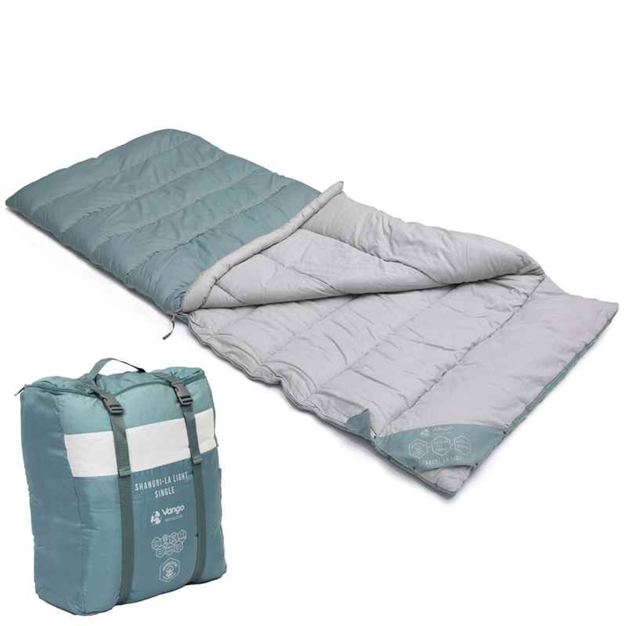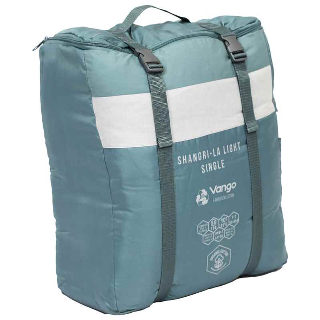 Discover the ultimate in camping comfort with the Vango Shangri-La Light Single Sleeping Bag, a luxurious addition to your outdoor gear that feels just like your bedding at home. This eco-friendly sleeping bag, part of Vango's Earth Collection, is crafted from organic cotton and 100% recycled polyester, offering a soft, hypoallergenic feel that keeps you cool and comfortable on warmer nights. Designed for a perfect night's sleep, its spacious square shape allows for greater freedom of movement, and an integrated headrest provides a better sleeping position for reduced aches and pains. Practical features like a two-way auto-lock zip with a zip guard prevent snagging, while the compression carry bag ensures a small pack size for easy storage and transport. With a 5.5 Tog rating and a comfort temperature of 16°C, this versatile sleeping bag is perfect for camping, campervan trips, or as a cosy spare for guests. Caring for the sleeping bag is easy as it is machine washable at 30 degrees.