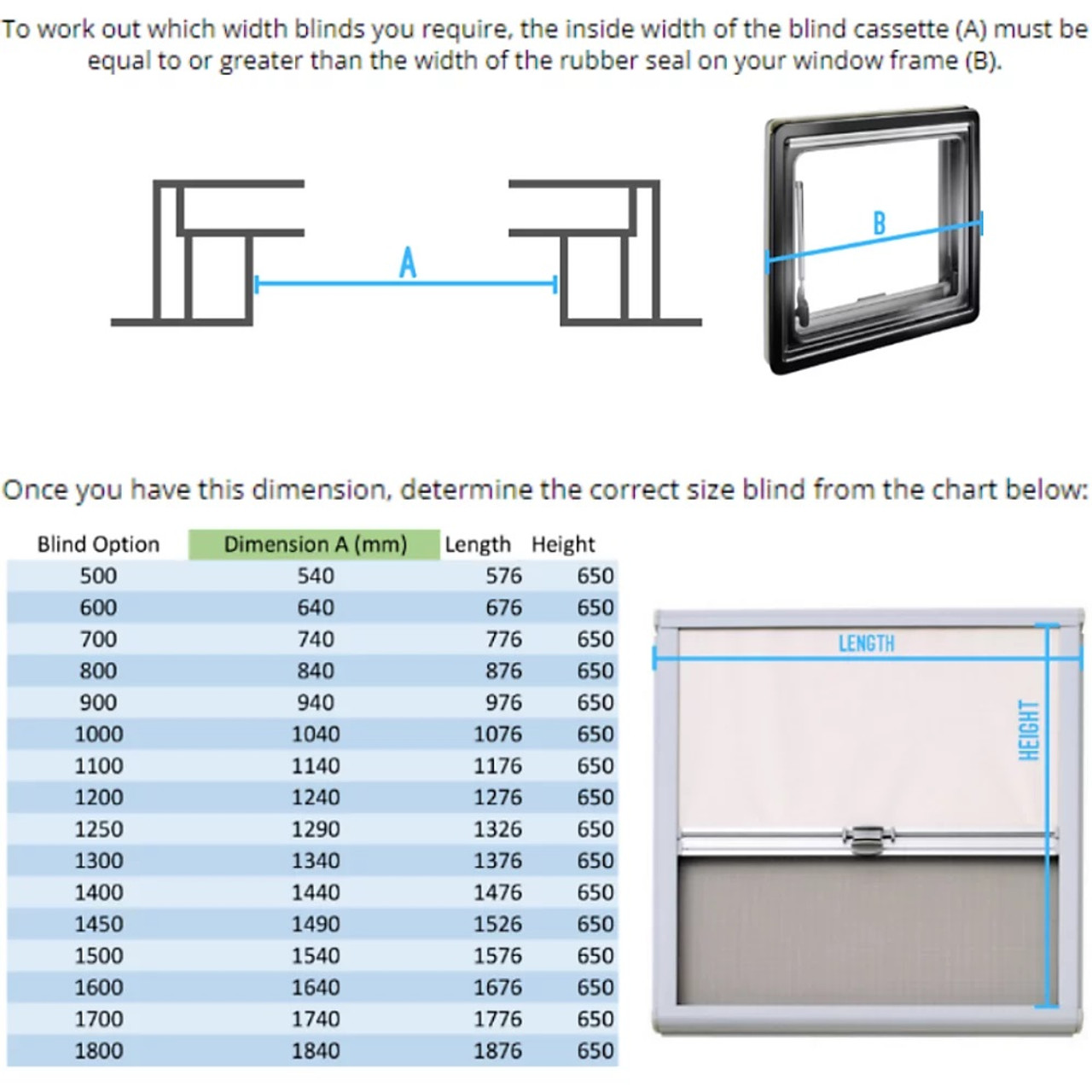 To work out which width blinds you require, the inside width of the blind cassette (A) must be equal to or greater than the width of the rubber seal on your window frame (B). Once you have this dimension, determine the correct size blind from the chart below:
