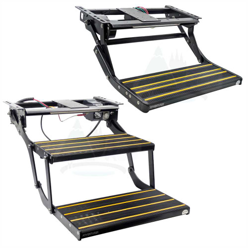 The Adventurer Fold-Out Electric Campervan Steps in Black are now available in two models. As a single step for smaller vehicles like campervans, or as a double step for taller vehicles that may be higher up from the ground, such as motorhomes. Designed for durability and easy access in your campervan or motorhome, crafted from durable aluminium alloy making it suitable for a range of vehicles.