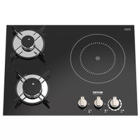 This compact cooking hob features an induction hob on the right hand side, with two gas cookers on the left, with a control panel on the right hand side.