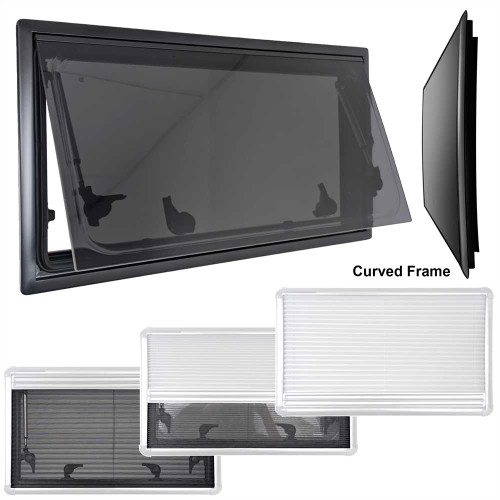 These windows are practical and stylish. Featuring a sleek aluminium frame with high-quality, tinted double glazed UV resistant acrylic. This ensures both durability, privacy and protection against the suns UV rays. Available in various sizes to cater to your needs and the size of your campervan. The durable aluminium frame and stainless steel strut rods (with the exception of the 818 x 315mm model which comes with plastic struts) are designed for stability and performance, ensuring that your window has reliable a long lifespan. Featuring a tinted double glazed window and pleated blind and flyscreen within a PVC frame, the Adventurer Curved Frame low profile window ensures privacy when needed and helps to keep light out and adjust light levels. The flyscreen also helps to provide airflow yet keep bugs out.