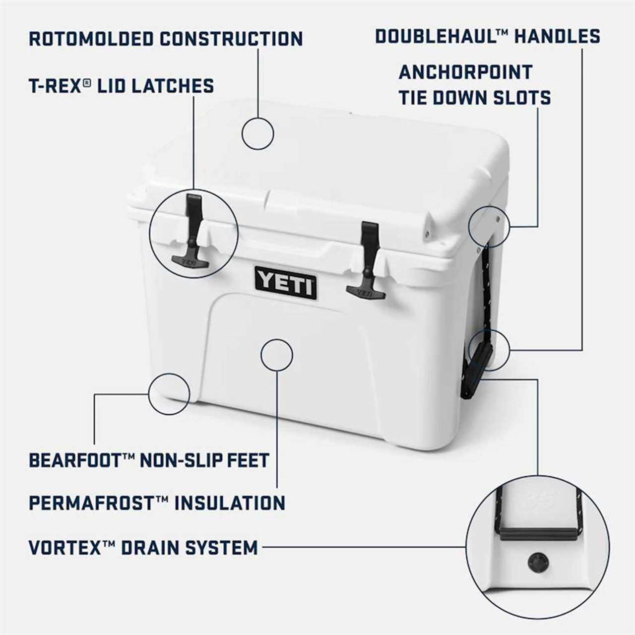 The Tundra 35 is a outdoors ice chest designed with tough construction, made for fishing, camping, boating, barbecuing and beer drinking! Available in four colours including White, Charcoal, Navy & Tan! Reputed for its superior ice retention and its thick, freezer-grade insulation that keeps ice frozen for days on end. The YETI Tundra 35 Cool Box is a camping essential for your next outdoor adventure! Able to store food and drink enough for four people, this YETI cooler is ideal for overnight camping trips! Featuring rotomolded construction and a bearproof design, this ice box is virtually indestructible, making it guaranteed to last year after year.