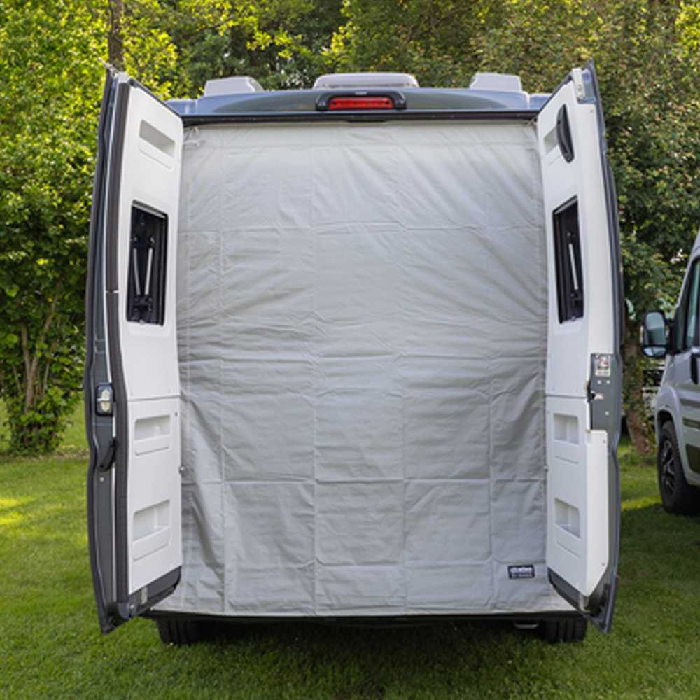 A simple, yet effective canopy for larger vans with barn doors. Used with an optional set of king poles (sold separately) it creates a useful sun canopy or used alone it provides a privacy/shower curtain for your campervan. It attaches, quickly and easily, using velcro to the van.