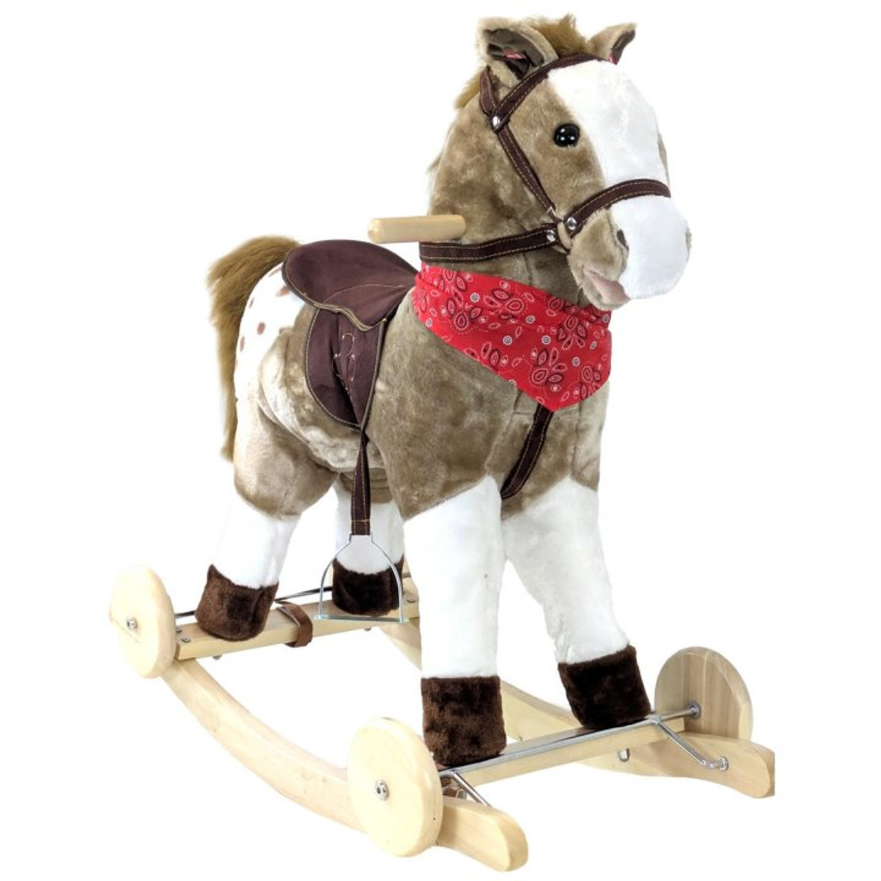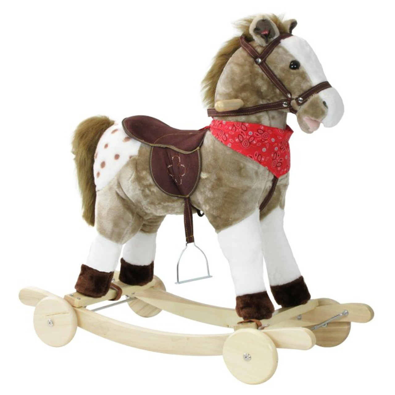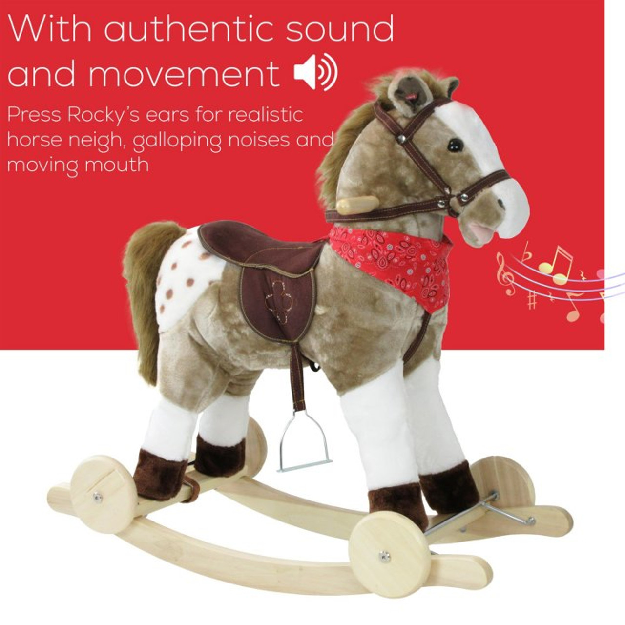 Rocky the Rocking Horse neighs and makes clip clopping noises when you touch either one of his ears, and as well as being a supreme rocker and roller also comes with flip down wheels so that he can be pushed along!